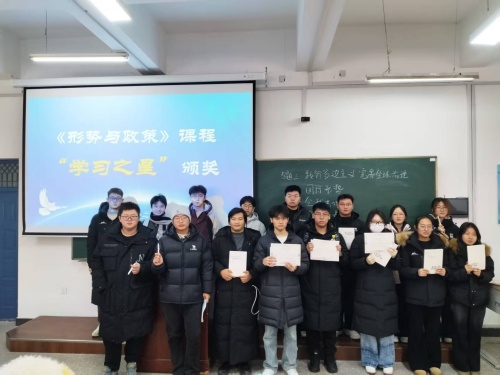 “形势与政策”课程兼具时效性、理论性与实践性,引导学生从“被动接受”转向“主动探究”,是提升课程教学质量的关键所在。教研室立足课程核心特点,创新推行课堂表现奖励机制,将专项预算精准投入到学生激励工作中,把学生学习过程中的点滴努力、每一次主动参与、每一份思想进步,都转化为可触摸、可感知的荣誉。这一举措有效打破了传统思政课堂“单向灌输”的局限,点燃了学生的学习热情,推动学生学习态度实现从“要我学”到“我要学”“我乐学”的深刻转变。如今,主动关注时政热点、积极参与课堂研讨、主动分享思想感悟已成为课堂常态,课堂“抬头率”“点头率”持续提升,浓厚的学习氛围蔚然成风,学生的政治素养与思辨能力在主动参与中不断提升。