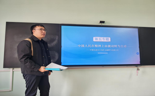 随后,教研室骨干教师范雪松老师围绕第五专题“中国人民在精神上由被动转为主动”,开展了系统深入的专题串讲。他从近代中国社会的历史背景切入,清晰梳理了中国人民精神觉醒的发展脉络,深刻阐释了这一历史转向的重大历史意义与时代价值,完成了全维度、多层次的系统梳理与逻辑建构。整个讲解严格紧扣《中国近现代史纲要》课程教学大纲要求,牢牢把握思政课立德树人根本任务,层层递进、逻辑清晰地拆解专题教学框架,为专题教学的有序实施提供了清晰思路与方法指引。同时,范雪松老师结合自身教学实践,重点分享了“新文化运动”“十月革命”“五四运动”等关键历史节点的优质教学案例与史料素材,进一步丰富了专题教学内容,增强了课堂教学的历史厚重感,为提升课堂教学实效、落实思政育人目标提供了有力支撑。